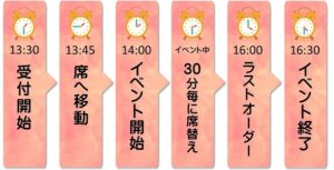 開始時間になると司会(スタッフ)より挨拶、当日の流れや注意事項などの簡単な説明があります。その後すぐに全員で乾杯をし、イベント開始です!